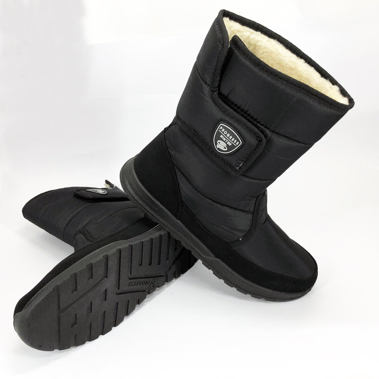 ✨ Збоку чобіт розташована липучка з брендовою нашивкою, яка слугує не лише декоративним елементом, а й додає зручності при взуванні. Гнучка та зносостійка підошва створює хороше зчеплення з поверхнею, що особливо важливо під час ожеледиці або снігу. Ця пара взуття стане надійним супутником у щоденних зимових прогулянках.